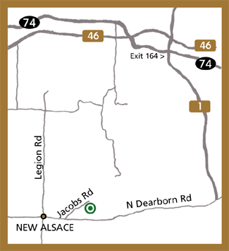 Take I-74 to the St. Leon/Lawrenceburg exit 164. Turn right and go 3 miles to North Dearborn Rd. Turn right, the veer left and go 2.7 miles. Winery is on right. |