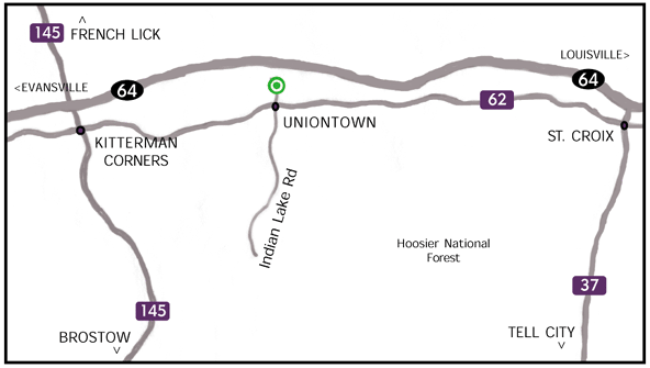 Travel on I-65 South to I-265 West (Exit 6B). Take I-265 West to I-64 West (Exit 0). Travel on I-64 42 miles to SR-37 South (Exit 79). Turn left on SR-37 South. At first intersection, SR-62, turn right. Travel 4 miles to North Indian Lake Road (CR 39) turn right. Winery is straight ahead.